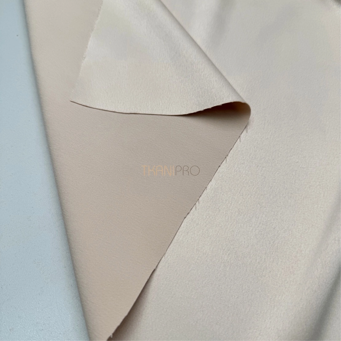 Лицевая сторона с умеренным сатиновым блеском (полуматовая). Изнанка матовая. Гладкая, шелковистая, струящаяся ткань, хорошо драпируется, держит форму.  Ложиться в красивые складки и драпировку. Скользкая на ощупь, комфортная к телу. Не просвечивает. Немного тянется поперек кромки. Мало мнется. Устойчив к механическим повреждениям (зацепки).