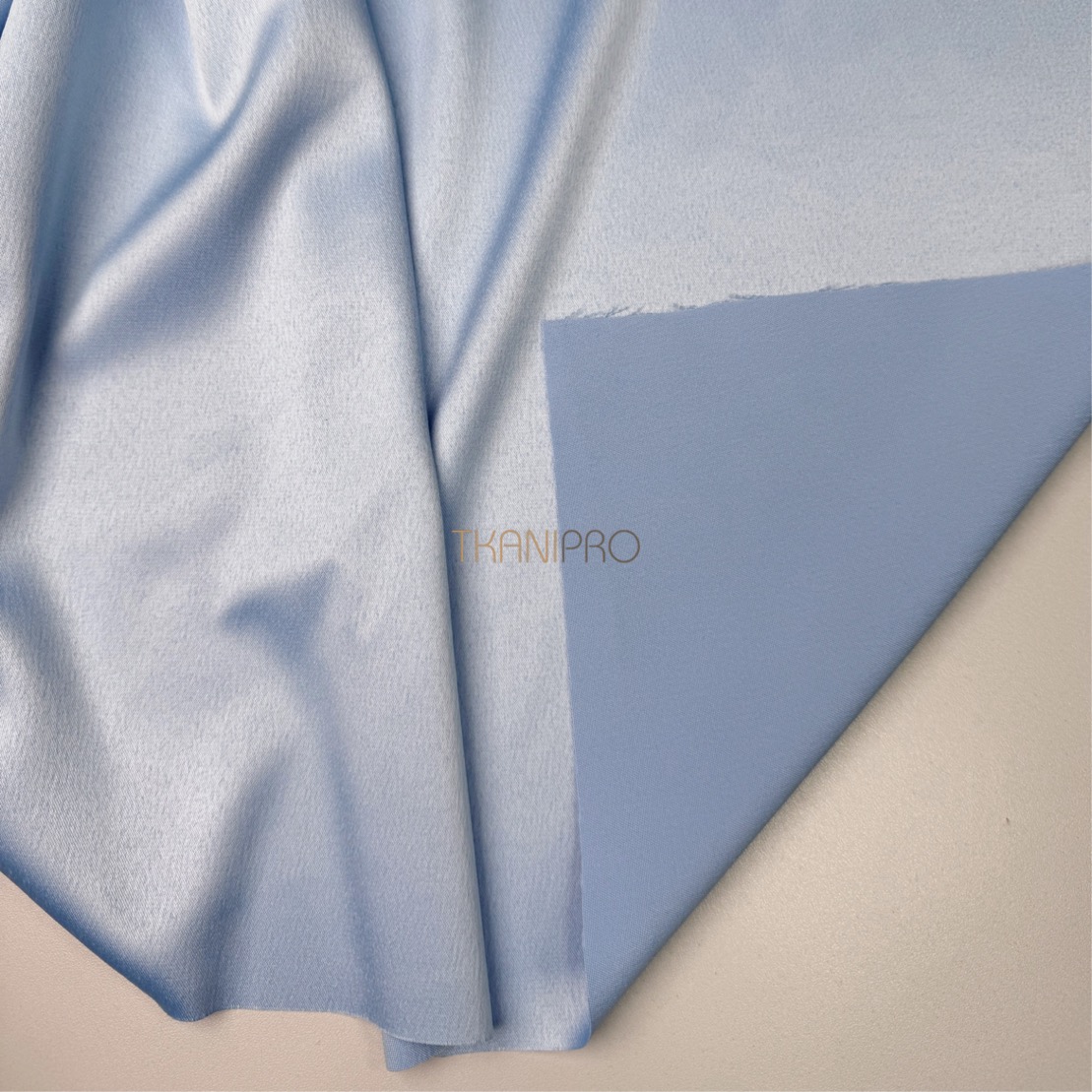 Лицевая сторона с умеренным сатиновым блеском (полуматовая). Изнанка матовая. Гладкая, шелковистая, струящаяся ткань, хорошо драпируется, держит форму.  Ложиться в красивые складки и драпировку. Скользкая на ощупь, комфортная к телу. Не просвечивает. Немного тянется поперек кромки. Мало мнется. Устойчив к механическим повреждениям (зацепки).