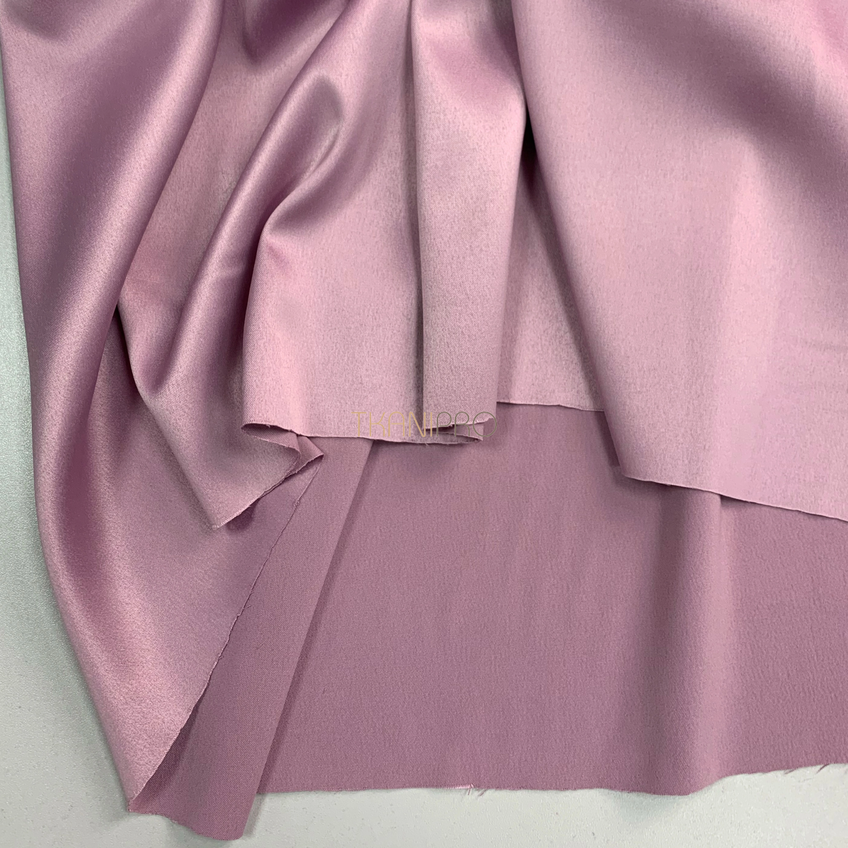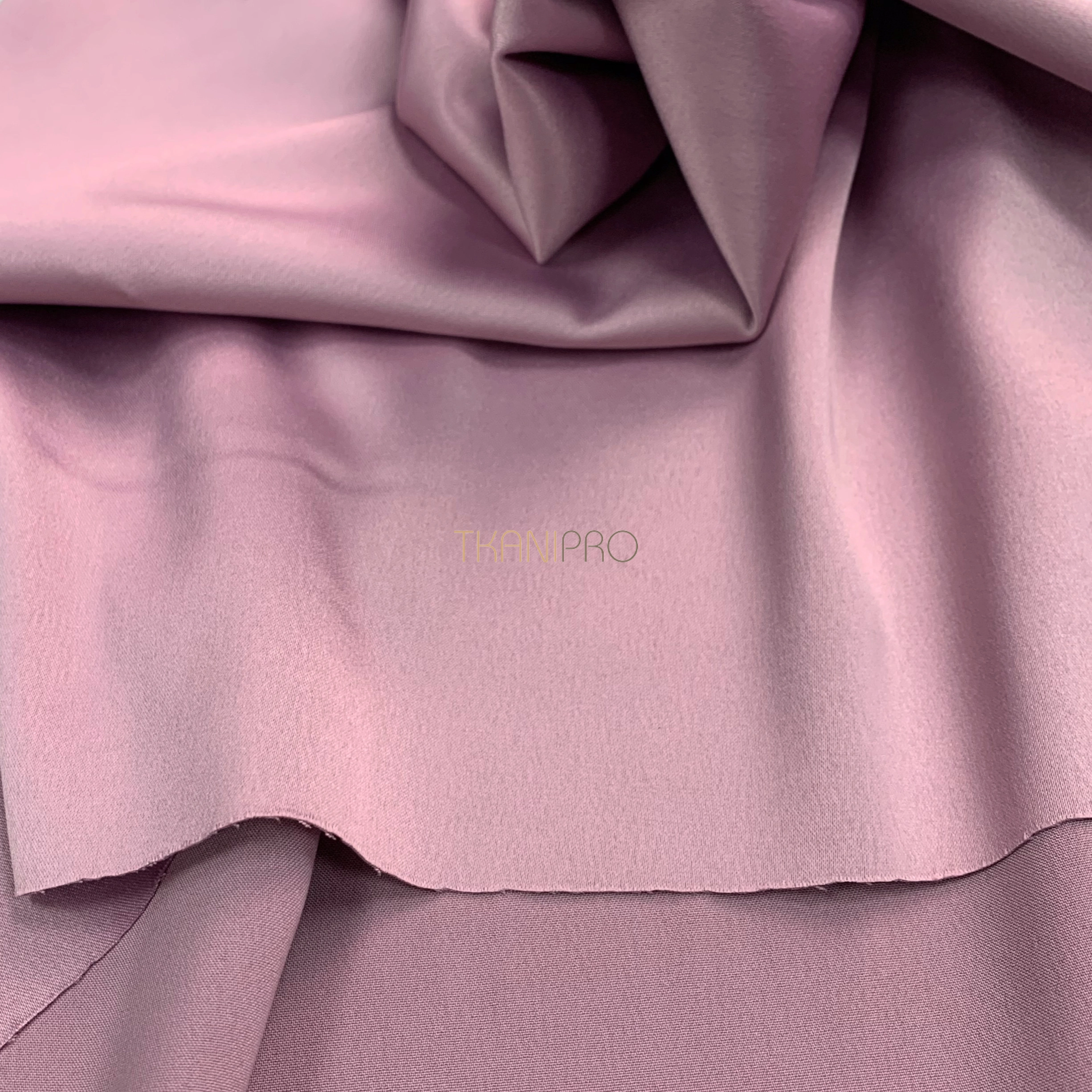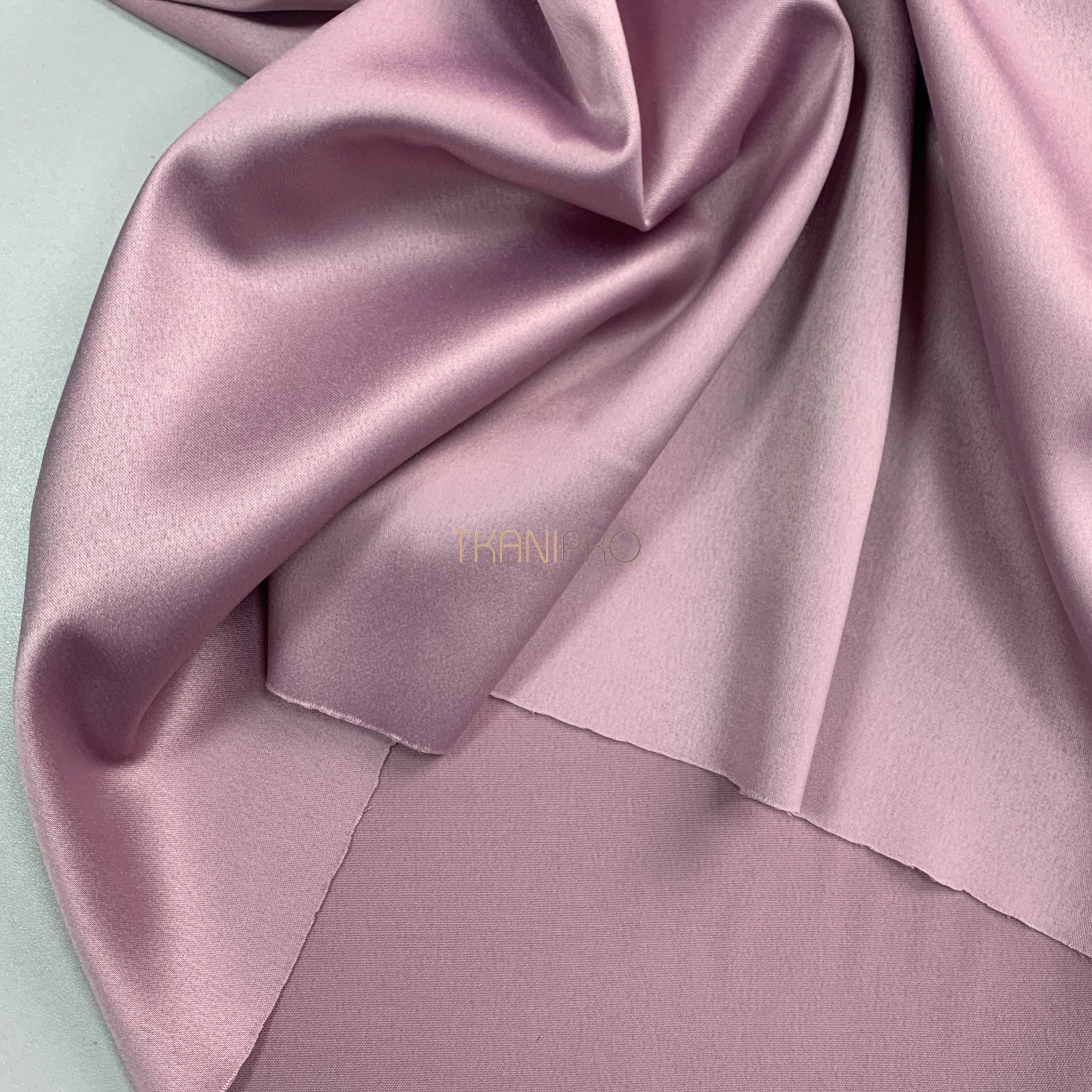 Лицевая сторона с умеренным сатиновым блеском (полуматовая). Изнанка матовая. Гладкая, шелковистая, струящаяся ткань, хорошо драпируется, держит форму.  Ложиться в красивые складки и драпировку. Скользкая на ощупь, комфортная к телу. Не просвечивает. Немного тянется поперек кромки. Мало мнется. Устойчив к механическим повреждениям (зацепки).