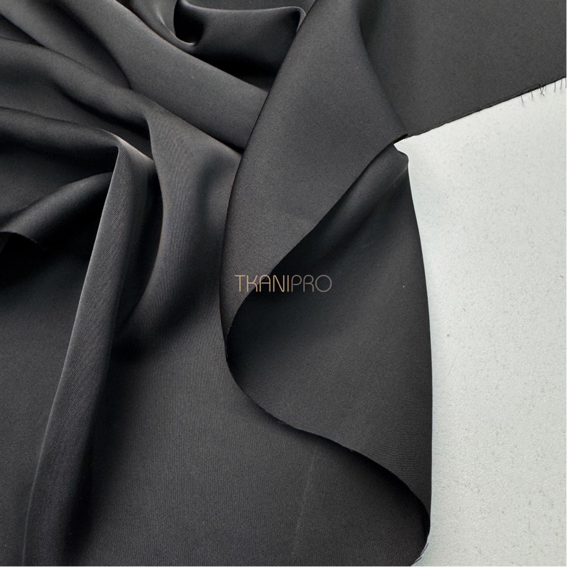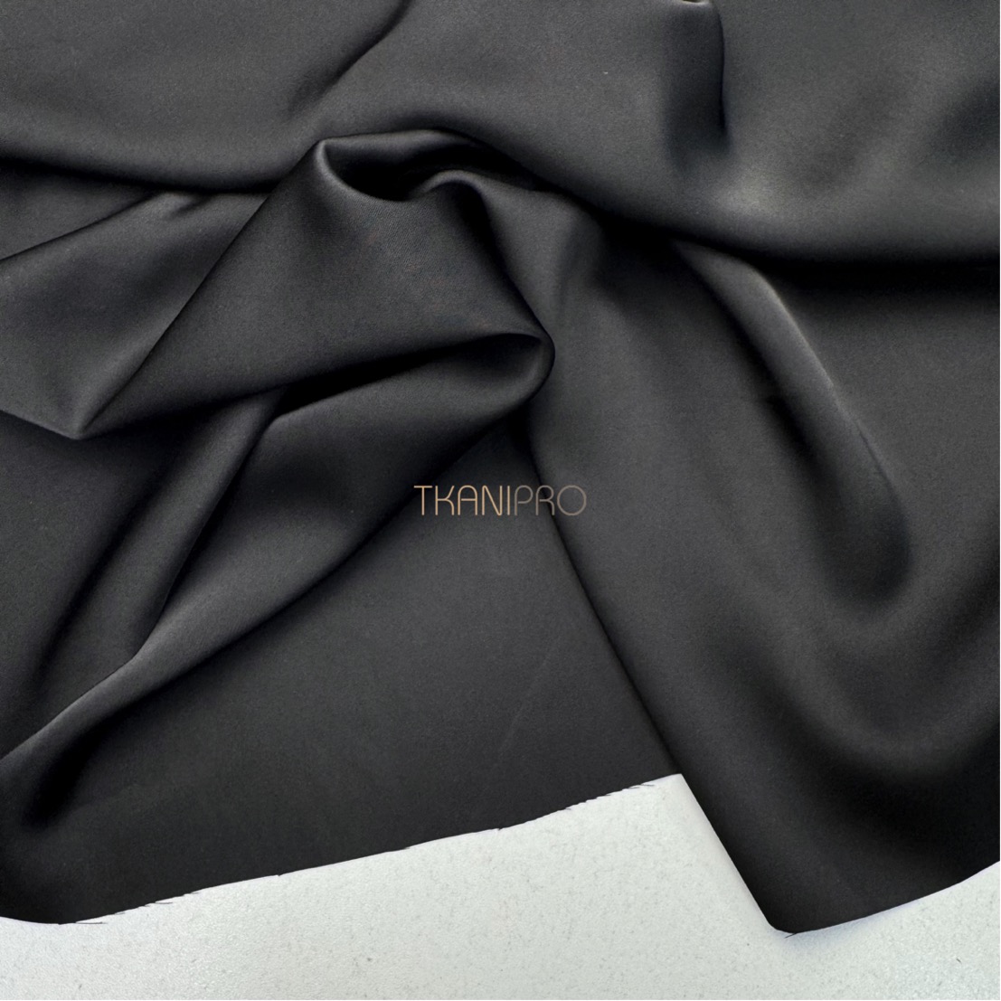 Ткань двусторонний сатин глубокого черного цвета — гладкая, шелковистая ткань с обеих сторон, которая идеально подходит для создания элегантных и утончённых образов. Она не мнется, проста в уходе и придаёт одежде роскошный блеск.