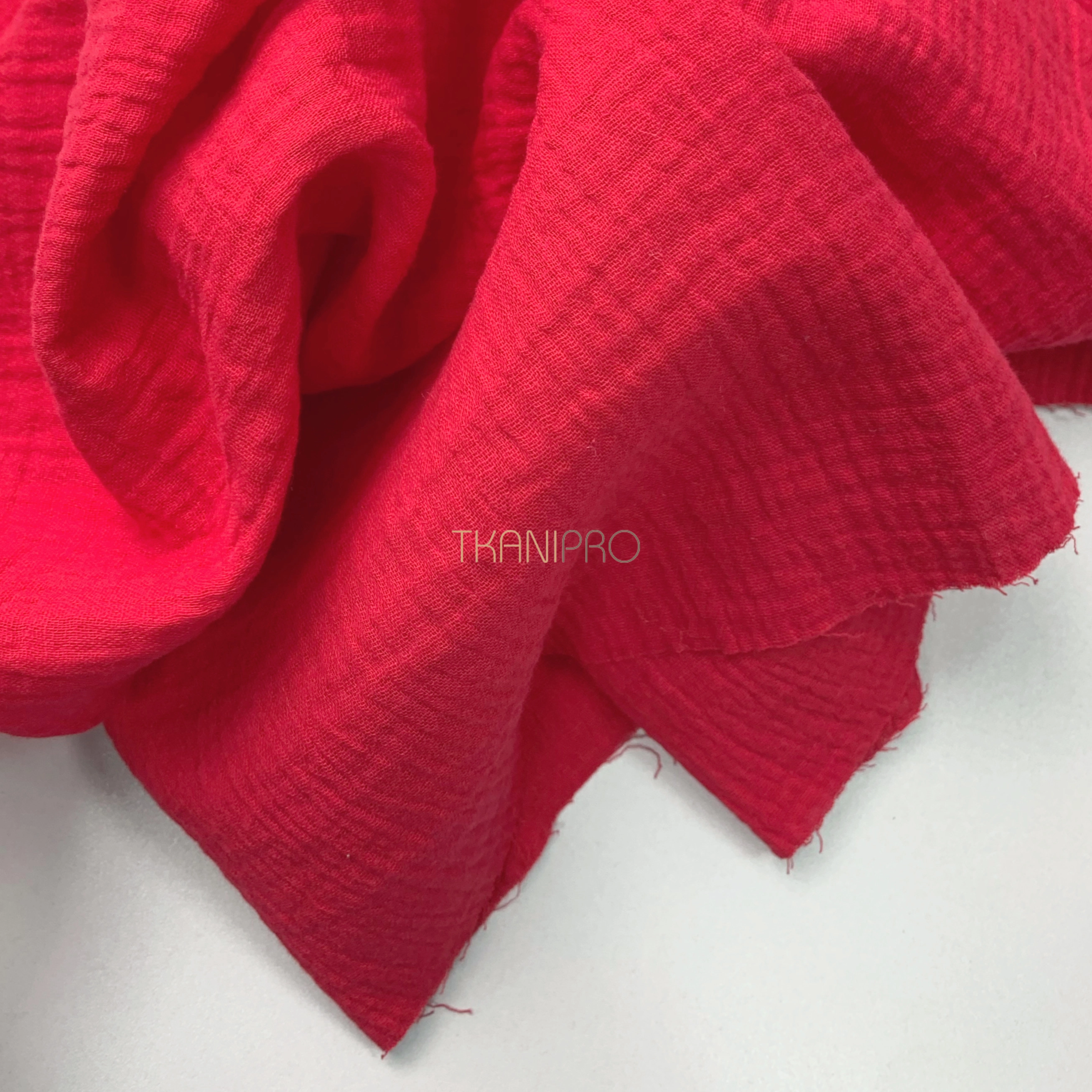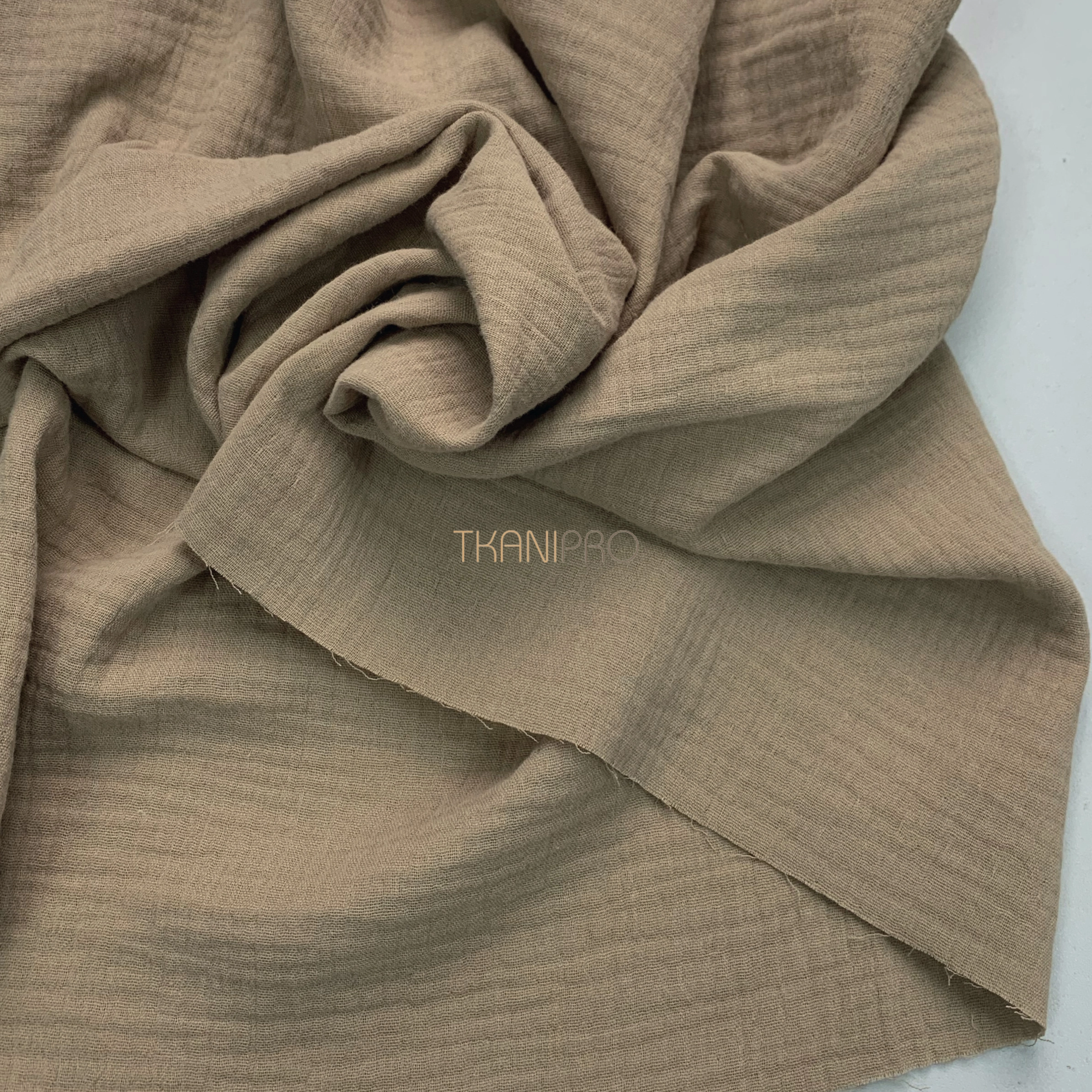 Натуральная, гигроскопичная, дышащая ткань. Не просвечивает. Не мнется, имеет незначительное растяжение поперек кромки за счет эффекта крэш. Не имеет ярко выраженной изнаночной и лицевой стороны. Нежная, комфортная.