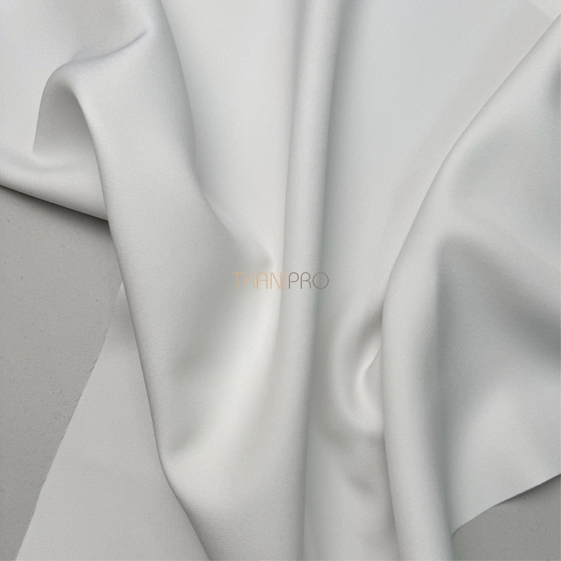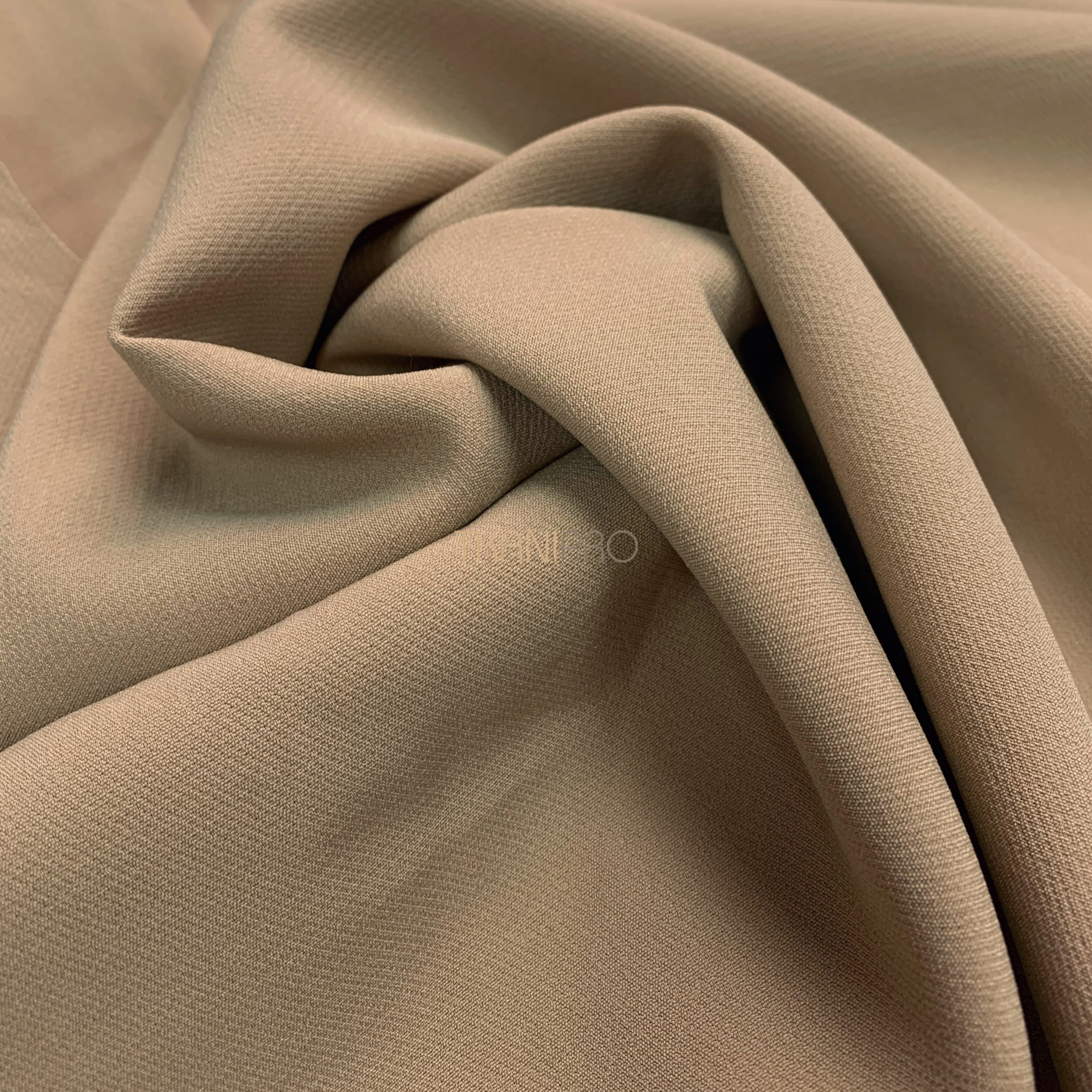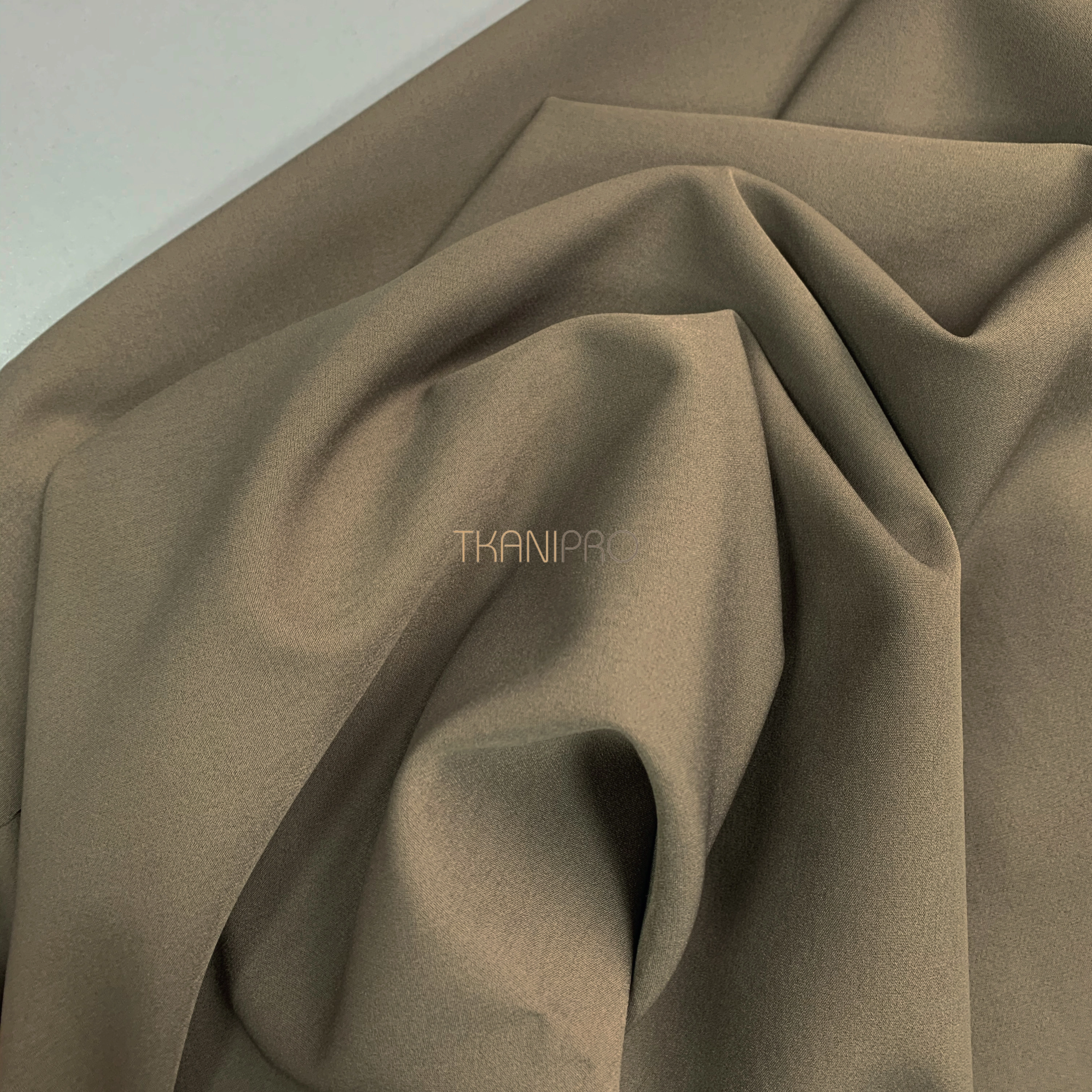 Ткань костюмная с креповой фактурой. Средней плотности, хорошо драпируется, пластичная. Гладкая, струящаяся, комфортная, пластичная.  Не мнется, не просвечивает. Светлые оттенки ткани могут немного просвечивать, для комфорта ношения, может потребоваться подкладка. Красиво закладывается в струящиеся складки, защипы, драпировку.
