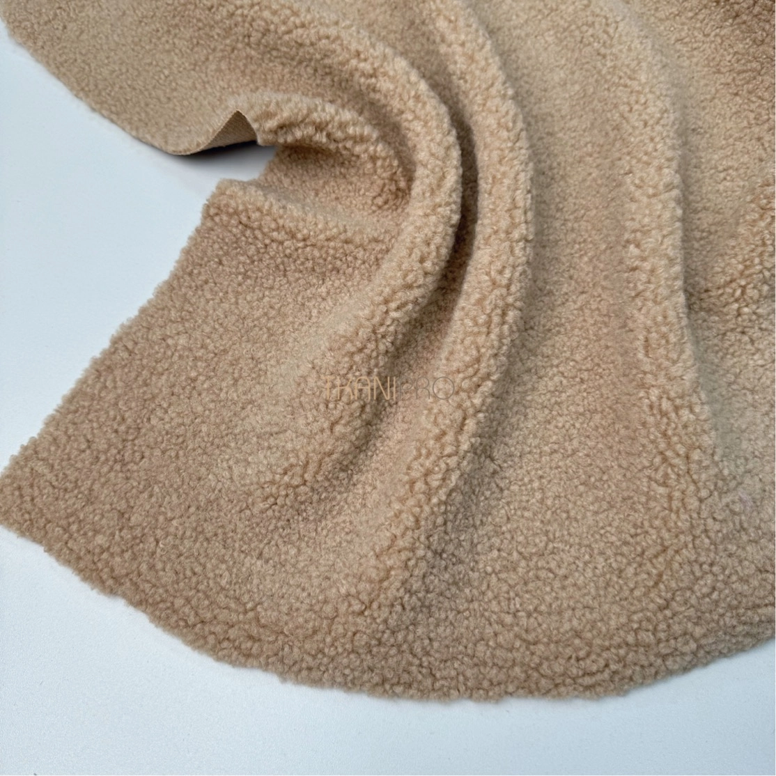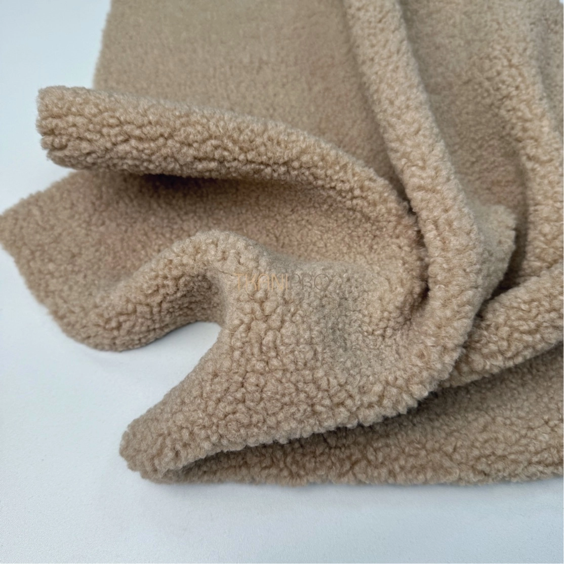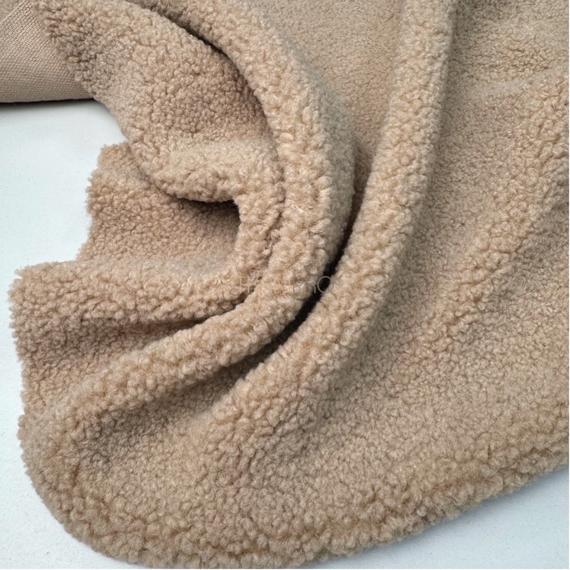 Искусственный мех "Тедди" характеризуется мягкой, бархатистой текстурой с коротким ворсом, создающей уютный и теплый эффект. Поверхность ткани напоминает мех плюшевых медведей, что делает её особенно приятной на ощупь. Мягкий, густой ворс высотой до 5 мм. Пластичный, хорошо драпируется. С изнанки трикотажная основа, немного тянется поперек кромки. На сгибе ткани не видна трикотажная основа, благодаря густому ворсу.