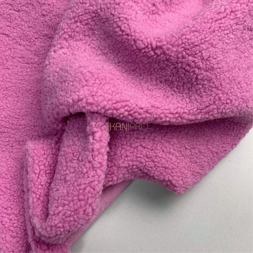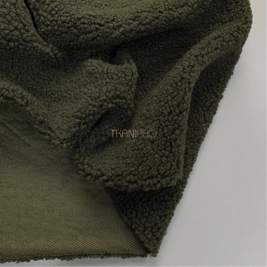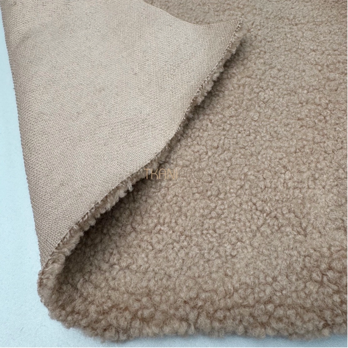 Искусственный мех "Тедди" характеризуется мягкой, бархатистой текстурой с коротким ворсом, создающей уютный и теплый эффект. Поверхность ткани напоминает мех плюшевых медведей, что делает её особенно приятной на ощупь. Мягкий, густой ворс высотой до 5 мм. Пластичный, хорошо драпируется. С изнанки трикотажная основа, немного тянется поперек кромки. На сгибе ткани не видна трикотажная основа, благодаря густому ворсу.