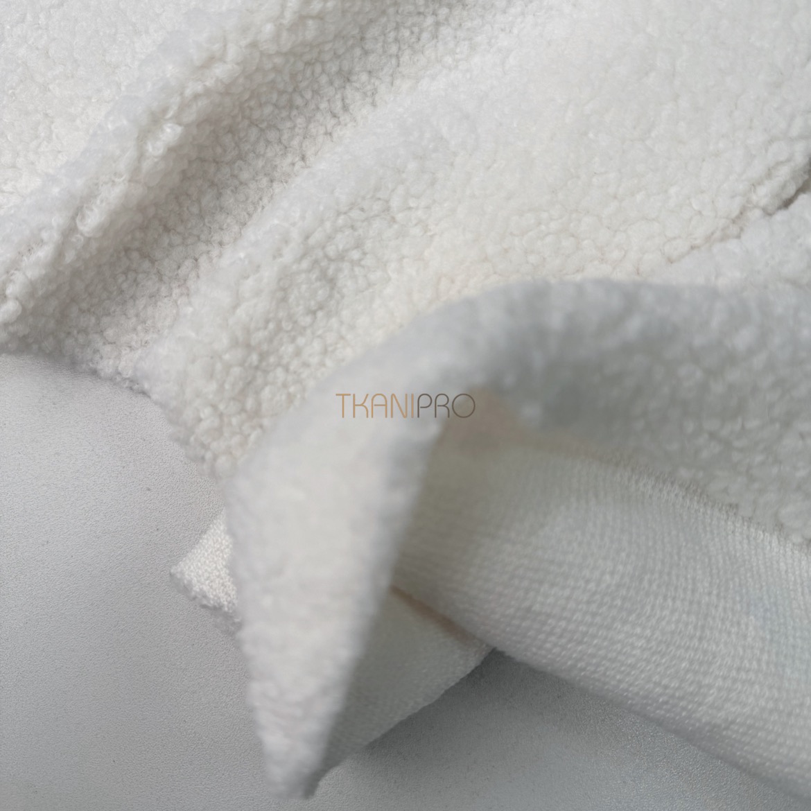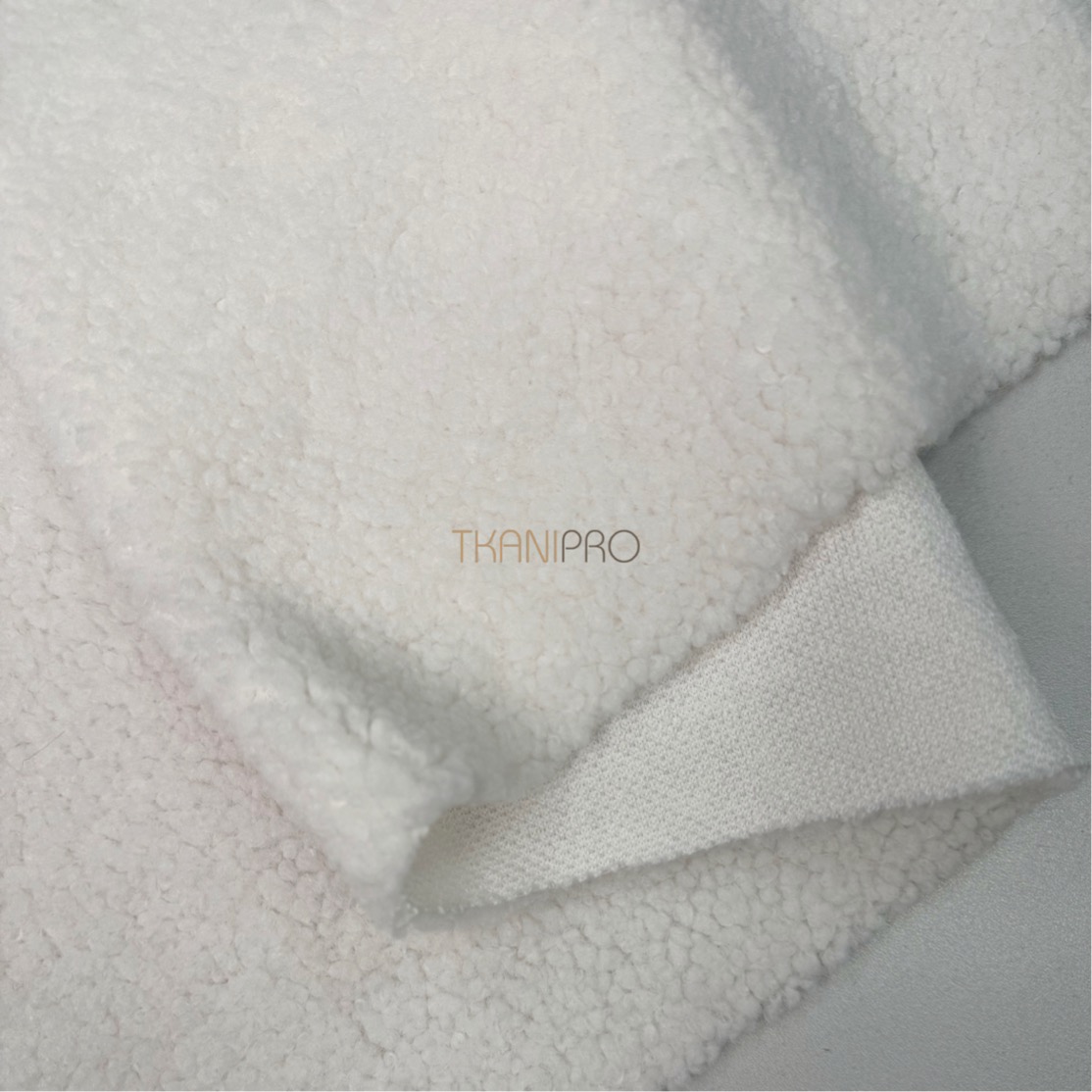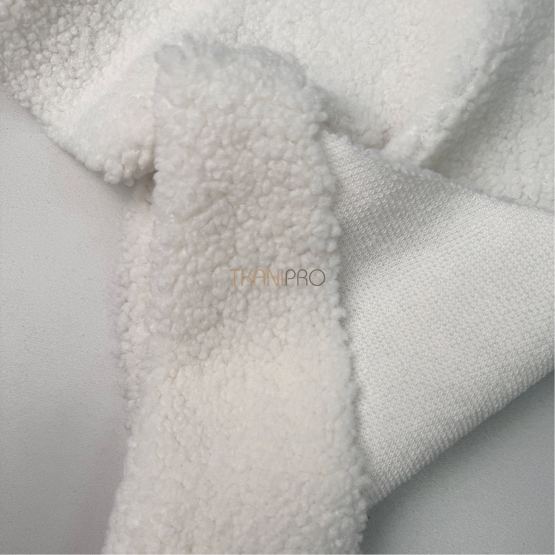 Искусственный мех "Тедди" характеризуется мягкой, бархатистой текстурой с коротким ворсом, создающей уютный и теплый эффект. Поверхность ткани напоминает мех плюшевых медведей, что делает её особенно приятной на ощупь. Мягкий, густой ворс высотой до 5 мм. Пластичный, хорошо драпируется. С изнанки трикотажная основа, немного тянется поперек кромки. На сгибе ткани не видна трикотажная основа, благодаря густому ворсу.