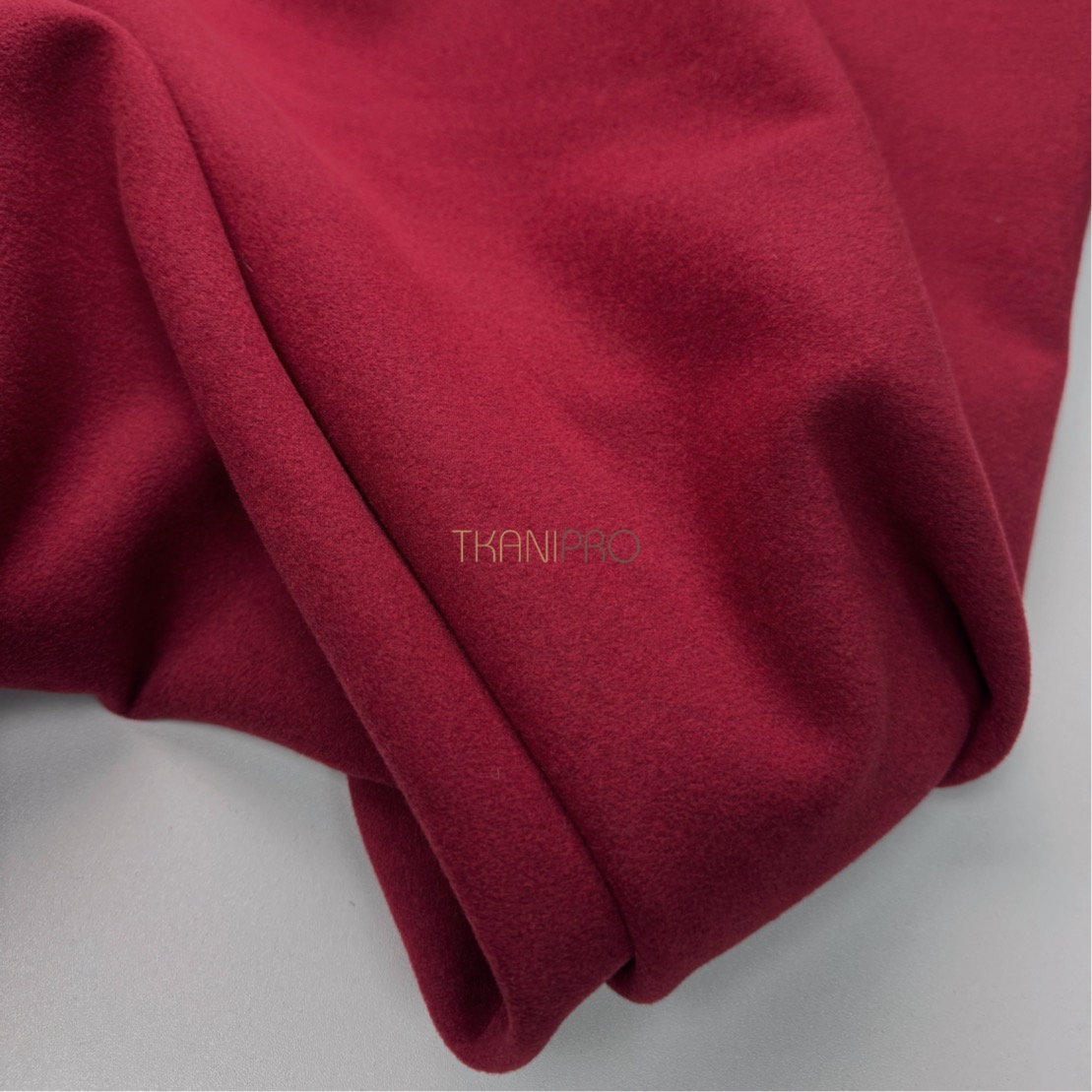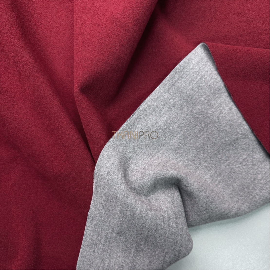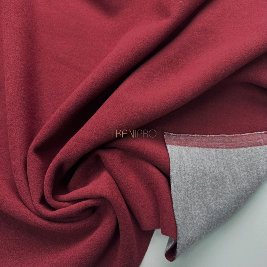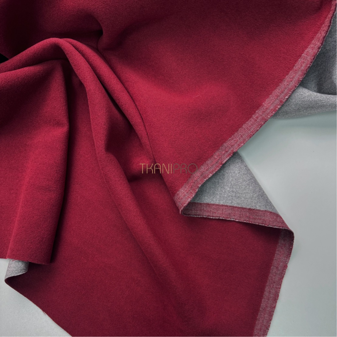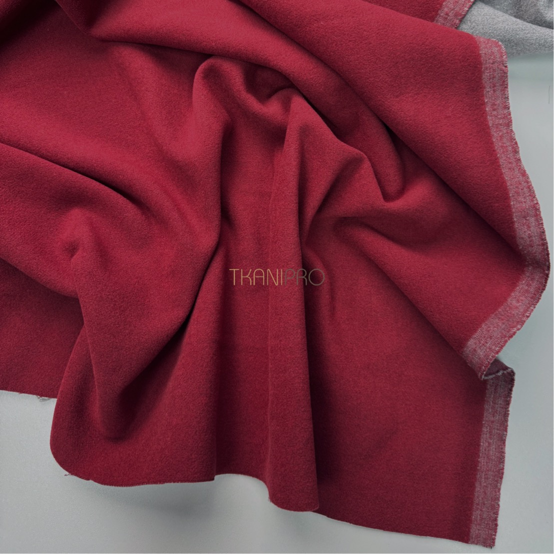 Ткань идет с маркировкой «double» или «double face». Одна сторона красного кирпичного цвета, вторая - серый меланж.