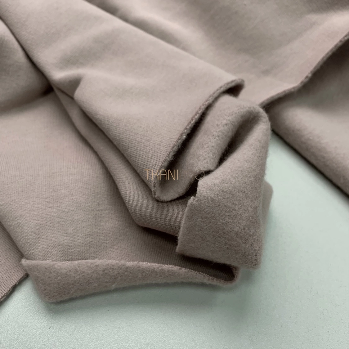Плотный трикотаж Футер, изготовленный из натурального хлопка высокого качества. Лицевая сторона гладкая, изнаночная - с объемным флисом. Этот начёс создаёт мягкий и пушистый слой, который придаёт дополнительный объём и уют, обеспечивая исключительное тепло. На ощупь ткань мягкая и приятная. Поверхность гладкая. Ткань устойчива к образованию катышек.