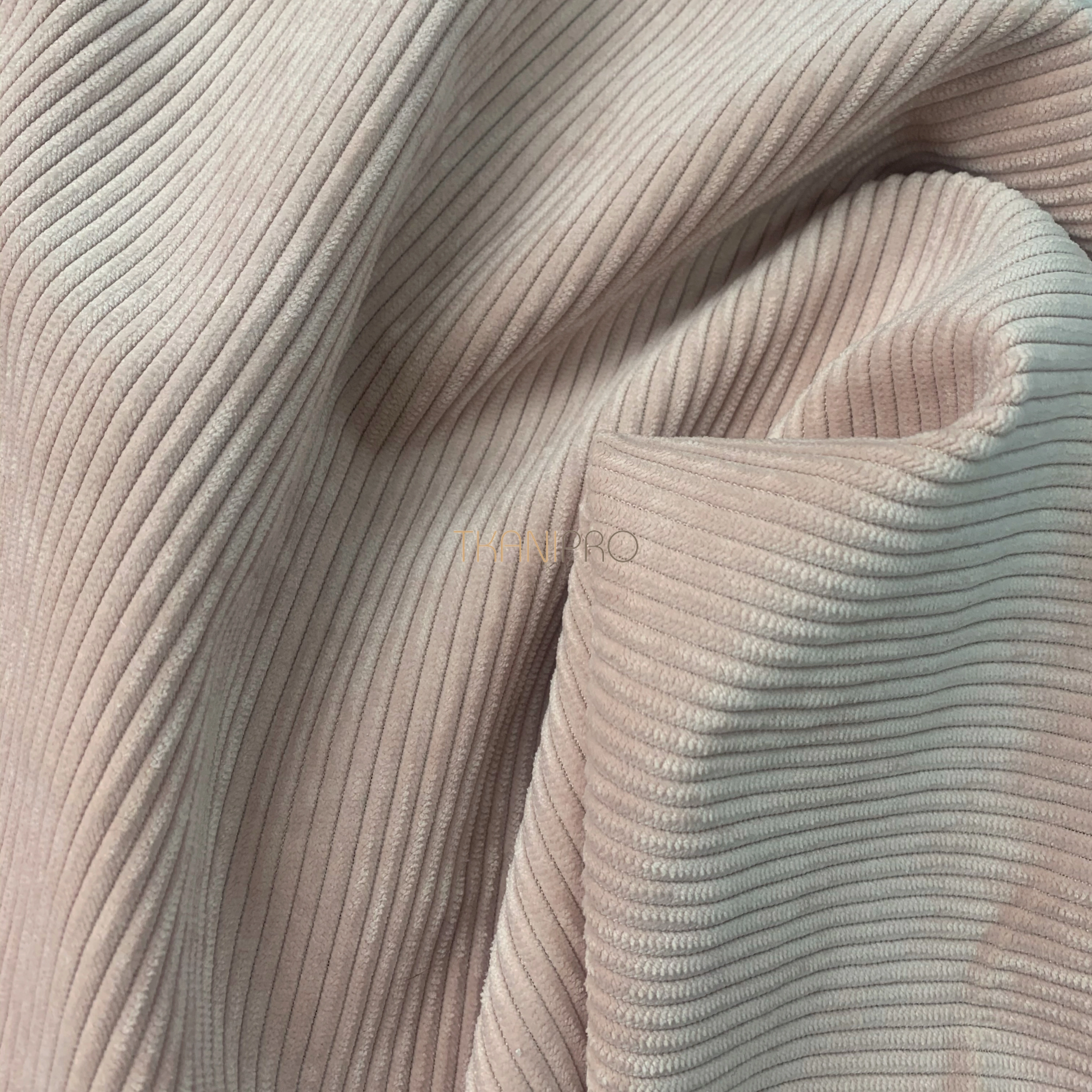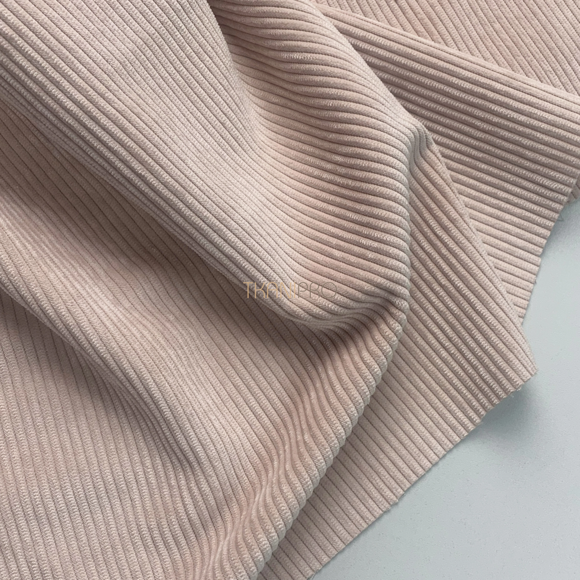 Мягкая, средней плотности, вельветовая ткань в средний рубчик 3 мм. Пластичная и мягкая ткань не стоит «колом», не тянется, хорошо драпируется и складывается в защипы и складки. Практичная вельветовая ткань с хорошей износостойкостью, в области ворсовых тканей, не закатывается, не подвержена пиллингу, устойчива к деформации и вытягиванию при носке и стирке. Не мнется даже после стирки, легко разглаживается с изнаночной стороны.