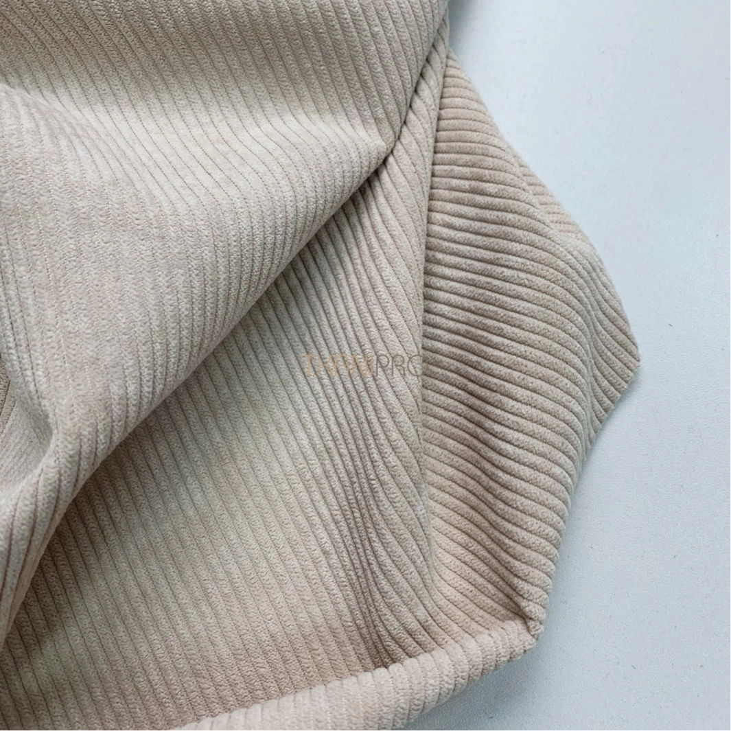 Мягкая, средней плотности, вельветовая ткань в средний рубчик 3 мм. Пластичная и мягкая ткань не стоит «колом», не тянется, хорошо драпируется и складывается в защипы и складки. Практичная вельветовая ткань с хорошей износостойкостью, в области ворсовых тканей, не закатывается, не подвержена пиллингу, устойчива к деформации и вытягиванию при носке и стирке. Не мнется даже после стирки, легко разглаживается с изнаночной стороны.